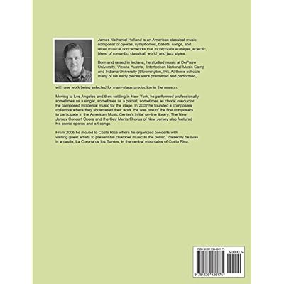 About the Author James Nathaniel Holland is an American classical music composer of operas, symphonies, ballets, songs, and other musical concertworks that incorporate a unique, eclectic, blend of romantic, classical, world and jazz styles. Born and raised in Indiana, he studied music at DePauw University, Vienna Austria, Interlochen National Music Camp and Indiana University (Bloomington, IN). At these schools many of his early pieces were premiered and performed, with one work being selected for main-stage production in the season. Moving to Los Angeles and then settling in New York, he performed professionally sometimes as a singer, sometimes as a pianist, sometimes as choral conductor. He composed incidental music for the stage. In 2002 he founded a composers collective where they showcased their work. He was one of the first composers to participate in the American Music Center’s initial on-line library. The New Jersey Concert Opera and the Gay Men’s Chorus of New Jersey also featured his comic operas and art songs. From 2005 he moved to Costa Rica where he organized concerts with visiting guest artists to present his chamber music to the public. Presently he lives in a castle in the central mountains of Costa Rica. Website: http://www.lacoronadelossantos.net/jamesnathanielholland.html YouTube Channel: https://www.youtube.com/user/composerjnholland Read more